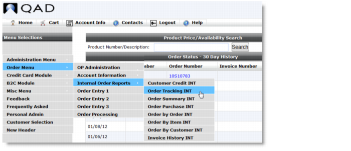 Internal Order Reports Use internal order reports to view summary or detailed customer order information. The menu location of internal order reports is Home Menu|Order Menu|Internal Order Reports. Internal Order Reports Menu Internal order reports include the following: • Customer Credit INT • Order Tracking INT • Order Summary INT • Order Purchase INT • Order by Order INT • Order by Item INT • Order by Customer INT • Invoice History INT